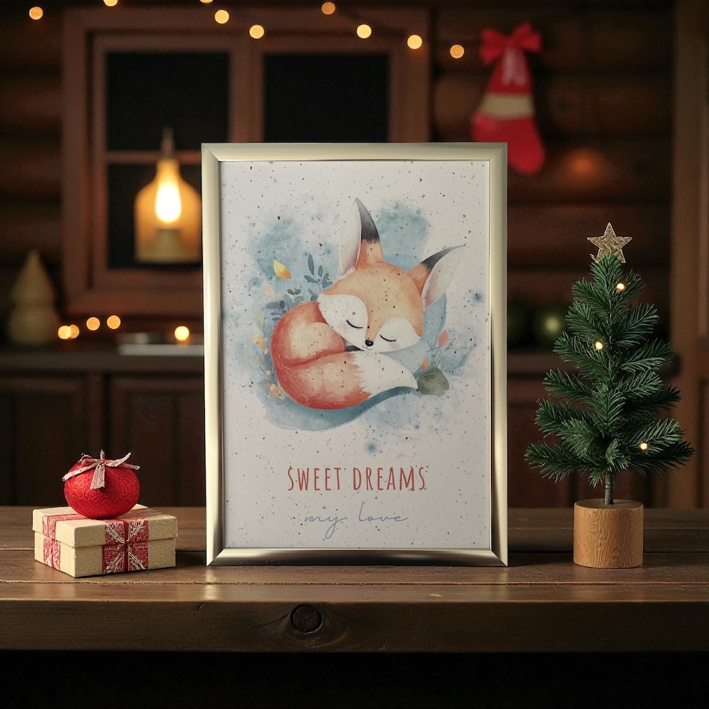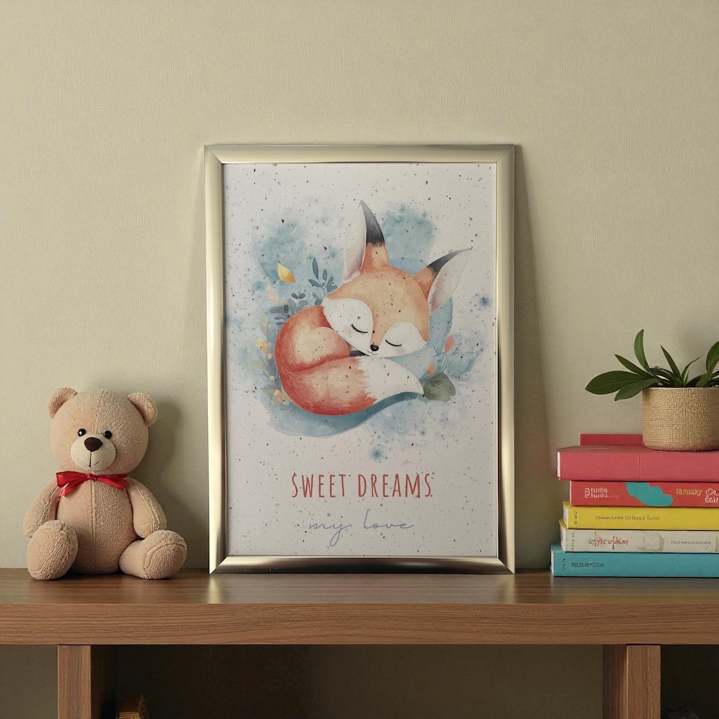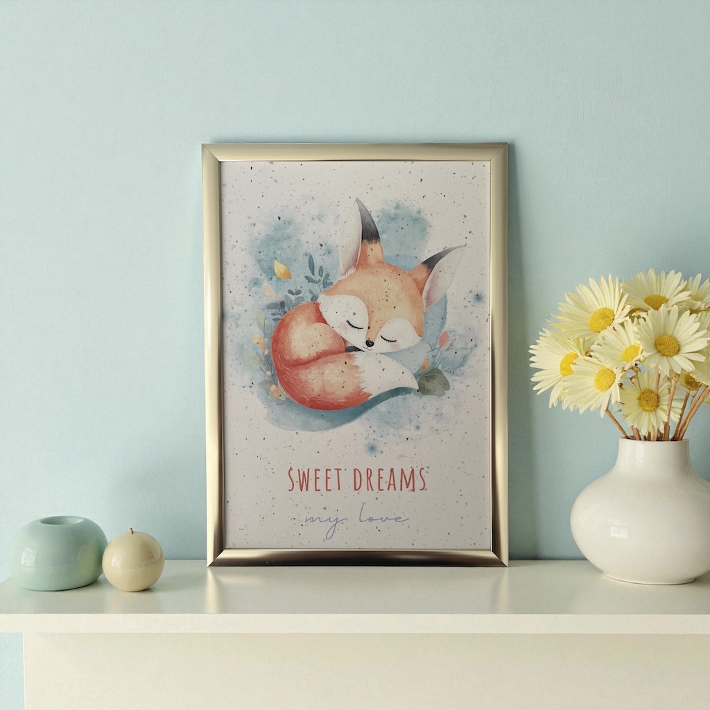 Plongez dans un univers de douceur avec cette charmante affiche représentant un petit renard endormi, entouré de nuances pastel et d’un décor délicatement aquarellé. Inspirée par la tendresse et la poésie de l’enfance, elle apporte immédiatement une atmosphère apaisante à la chambre d’un bébé ou d’un jeune enfant.