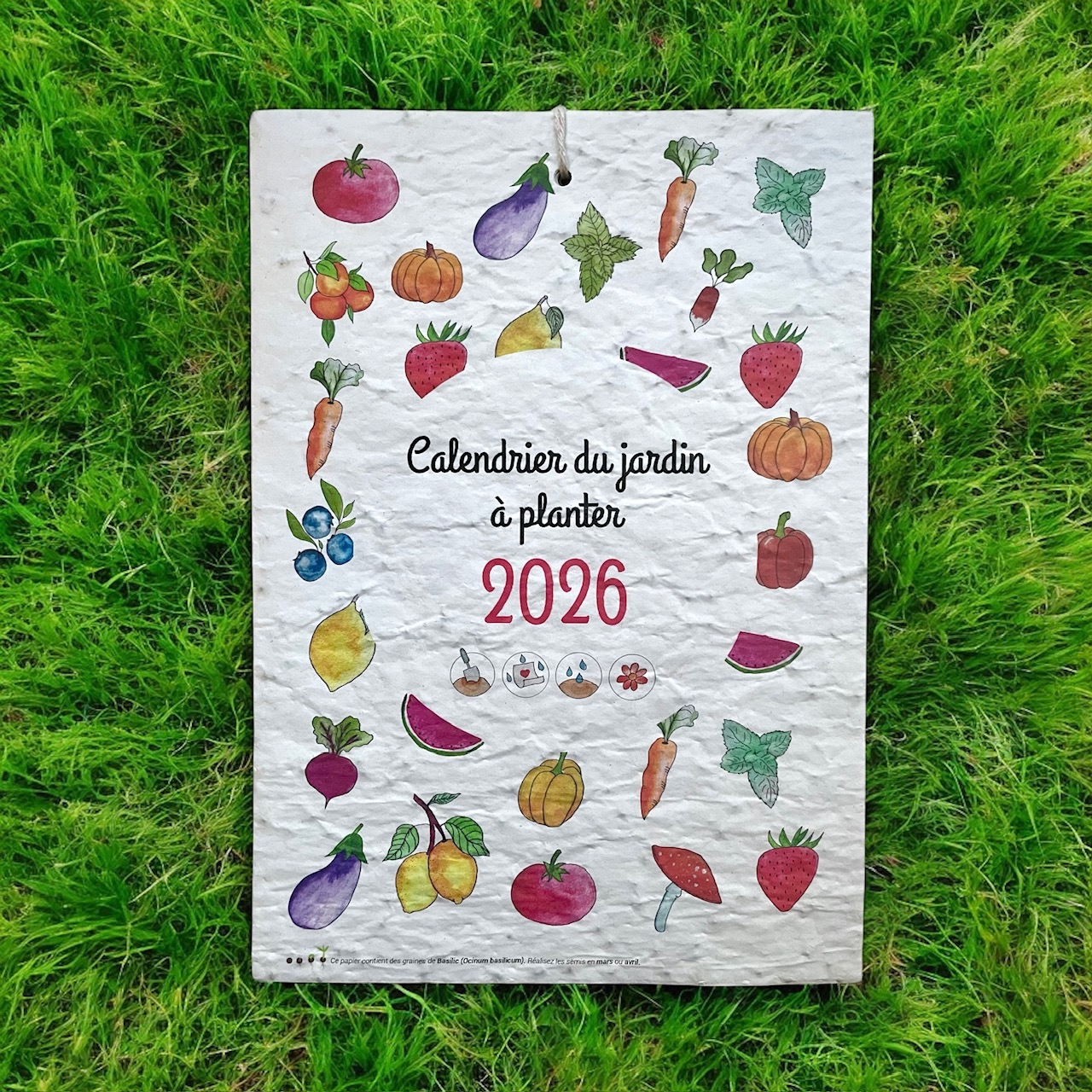 Chaque feuille est unique et renferme des centaines de graines non traitées et sélectionnées avec soin. Un système d’accroche permet au calendrier d’être affiché au mur.